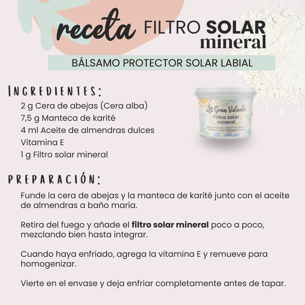 El filtro solar mineral es una mezcla en polvo de óxido de zinc y dióxido de titanio que se utiliza como ingrediente en la formulación de cremas solares con filtro físico. Ayuda a proteger la piel frente a la radiación UVA y UVB, actuando como una pantalla que refleja y dispersa los rayos solares. Es un ingrediente de origen mineral, que se incorpora a la fase grasa de la emulsión, y permite elaborar protecciones solares naturales y eficaces. Su uso está regulado por el Reglamento (UE) 2016/621, permitiendo su incorporación en cosmética en forma nano y no nano, con un límite máximo del 25% en la fórmula final.