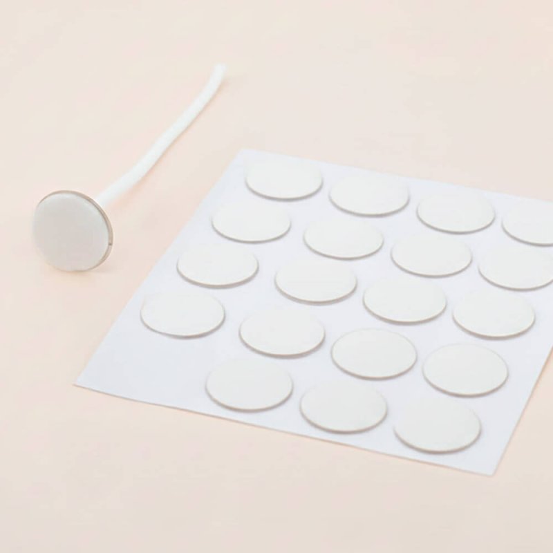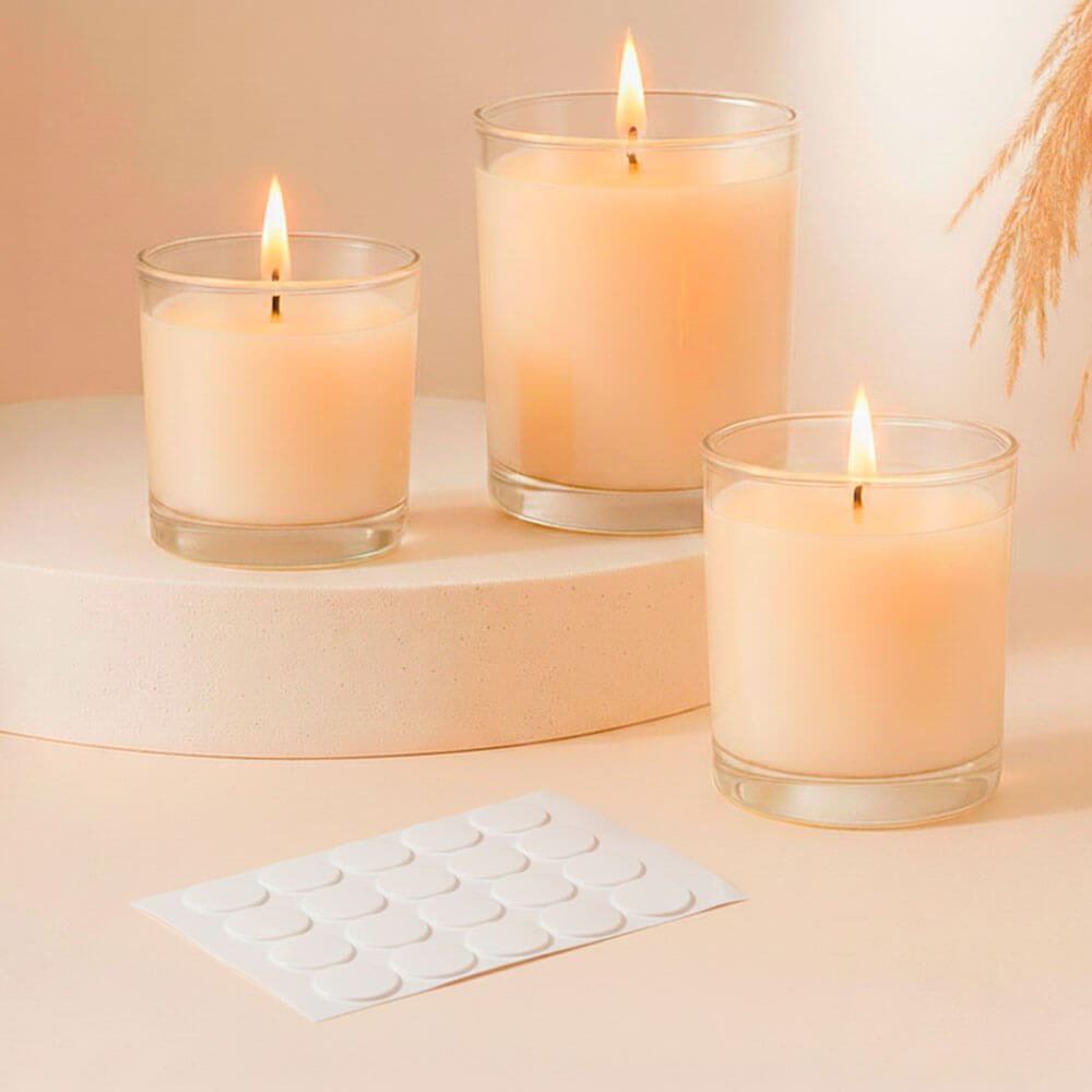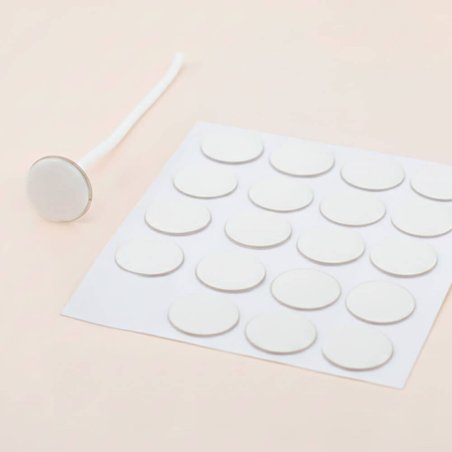 Pack de 20 autocollants grands pour supports de mèche. Ils sont double face et servent à fixer les œillets métalliques à la base de récipients comme des verres ou des pots. Grâce à ces autocollants pour mèches, vous garantirez qu’elles restent bien en place lors du coulage de la cire chaude, évitant ainsi qu’elles ne bougent ou ne se tordent. Ils sont pratiques, faciles à utiliser et résistants à la chaleur ! Spécialement conçus pour faire des bougies en récipient. Pour les utiliser, retirez la protection d’un côté, collez-la à la base de l’œillet, puis fixez l’autocollant au fond du récipient en appuyant légèrement.