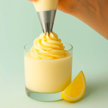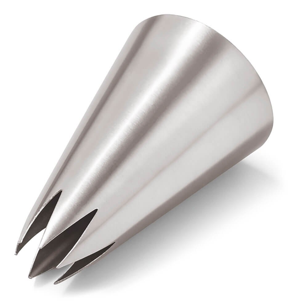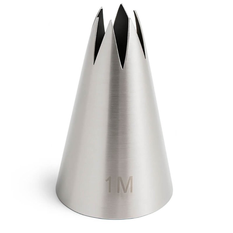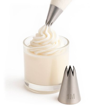 Cette douille pour poche à douille a une coupe en étoile qui permet de définir des pics et des volumes marqués dans la cire chantilly pour bougies. Elle fonctionne parfaitement lorsque la cire est entre 45–50 ºC et avec une texture aérée (type “crème fouettée”). Remplis la poche et applique avec une pression constante pour obtenir une finition homogène.