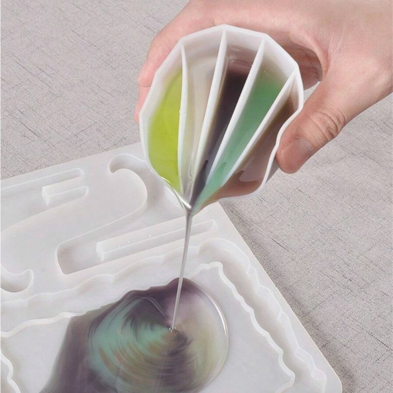 Cruche en silicone pour réaliser des savons colorés et des créations multicolores. Cela vous aidera à réaliser des designs spectaculaires et très frappants! Il est fabriqué en silicone et se caractérise par sa résistance, sa durabilité et son antiadhésif, c'est pourquoi il est très confortable et pratique à utiliser. Il dispose de 5 compartiments pour que vous puissiez remplir chacun d'eux avec une couleur différente. En les versant petit à petit dans le moule, on obtient des dessins et des formes très attractifs. Il est idéal pour fabriquer des savons avec la technique du marbrage ou du swirl, mais vous pouvez également utiliser ce pot pour de nombreux autres travaux manuels. Continuez à lire et découvrez sa polyvalence et comment l'utiliser pour réaliser des créations uniques.