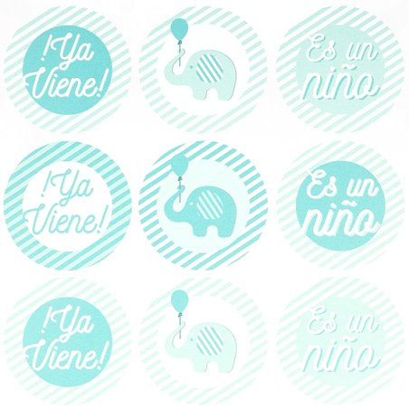 Blíster de 9 pegatinas redondas, de 5cm, ideales para baby shower. Cada blíster combina tres modelos diferentes de pegatinas: en unas puede leerse “¡Ya viene!”; otras están estampadas con un elefante y un globito; y otras llevan el texto: “Es un niño”. En estas pegatinas infantiles predominan los tonos azules. Son ideales para decorar fiestas y detalles de baby shower. Las pegatinas que puedes comprar en Gran Velada destacan por su resistencia y calidad. Se adhieren perfectamente en multitud de superficies (cartón, papel, plástico, vidrio, aluminio…) y son resistentes al agua. ¡Hazte con estas pegatinas y consigue un packaging perfecto para tus elaboraciones DIY!
