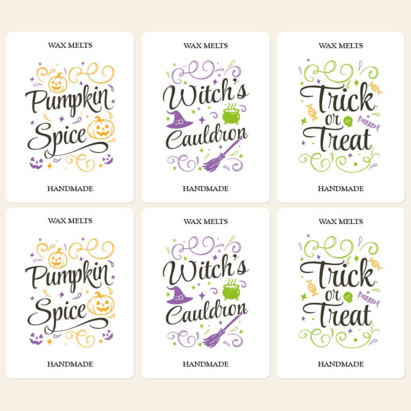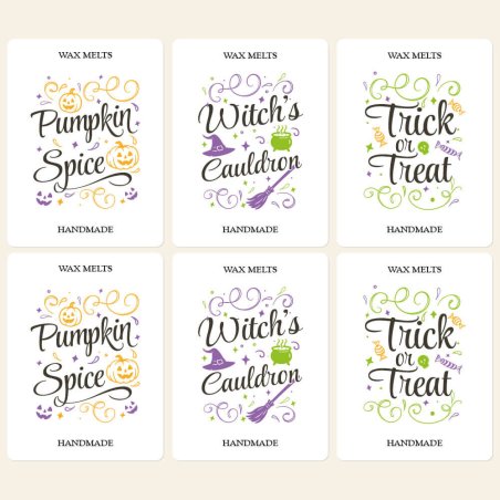 Estás a preparar os teus wax melts para Halloween? Estes autocolantes vão ajudar a dar-lhes um ar festivo e chamativo. Cada design foi criado para se destacar na embalagem e captar a atenção com tipografias criativas, desenhos e cores típicas desta celebração. Combina-os com ceras em tons roxos, laranjas ou pretos para uma apresentação impactante.