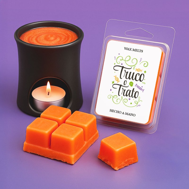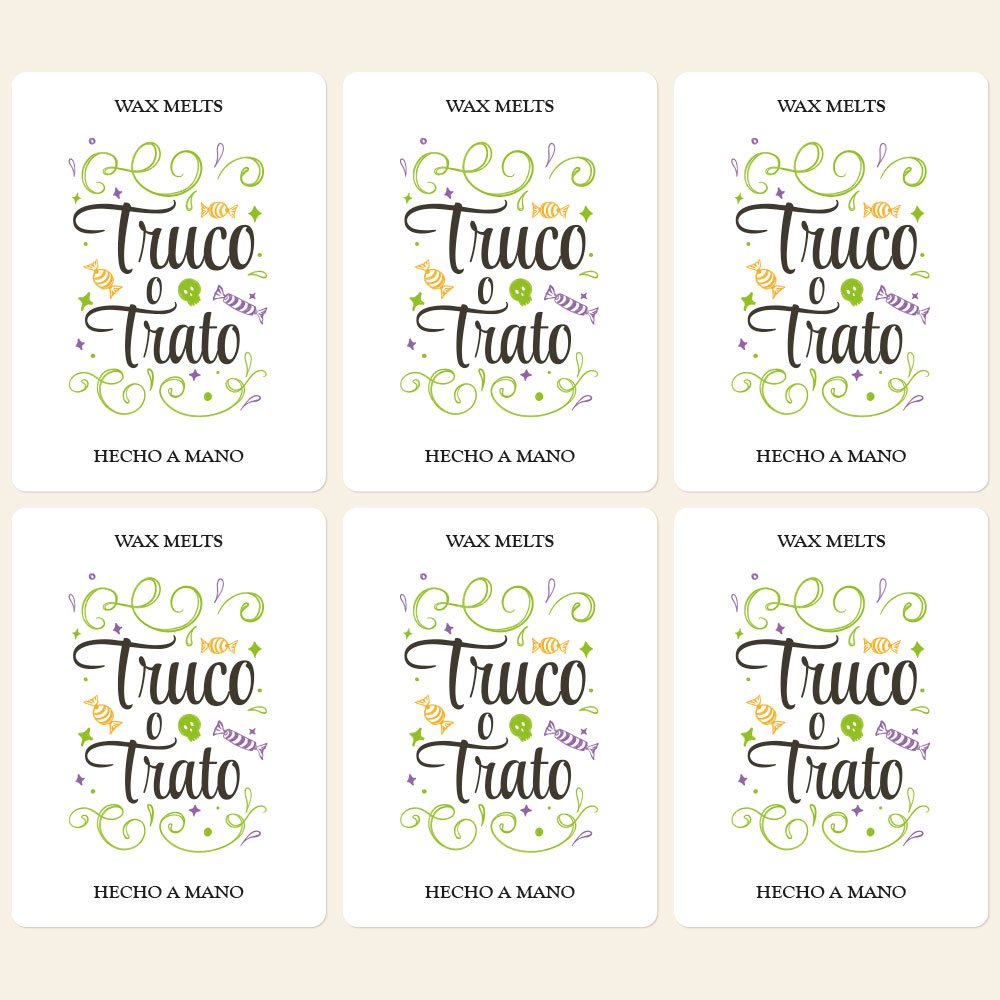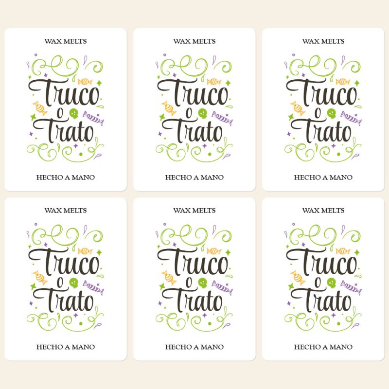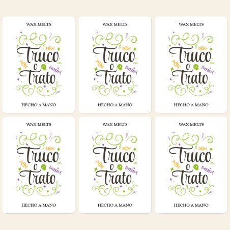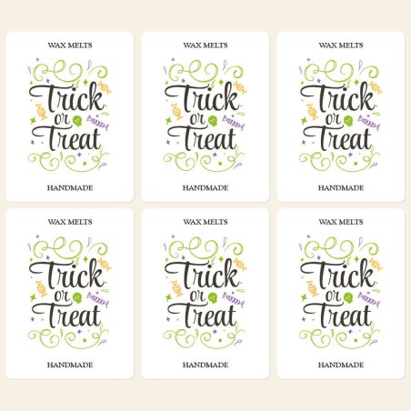 Pack de autocolantes para wax melts “Doçura ou travessura”, com design de Halloween alegre e chamativo. Perfeitos para dar um acabamento profissional às tuas ceras aromáticas em clamshell. Impressos a cores em papel autocolante de qualidade, com boa fixação em embalagens de plástico, vidro ou metal. Vendidos em pack de 6 unidades, todas do mesmo modelo.
