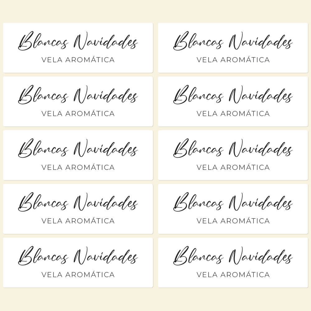 Autocolantes de Natal para velas em copo · “Branco Natal”, ideais para personalizar velas em copo, frascos e conjuntos de oferta. O seu design minimalista a preto sobre fundo creme confere um acabamento elegante e muito atual aos teus projetos DIY. Aderem facilmente a vidro, plástico, alumínio, cartão ou papel, permitindo-te criar séries de Natal sem necessidade de imprimir etiquetas.