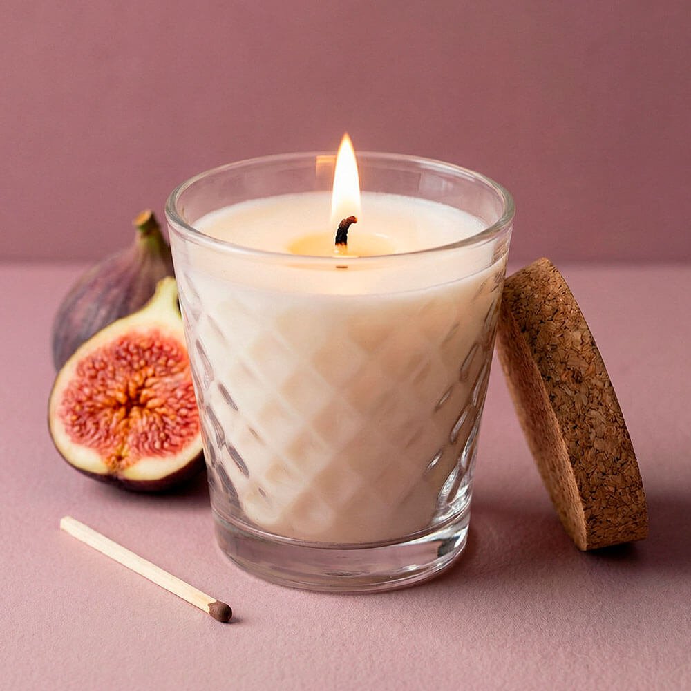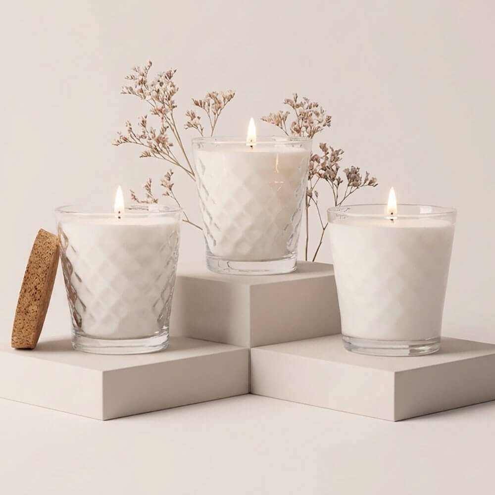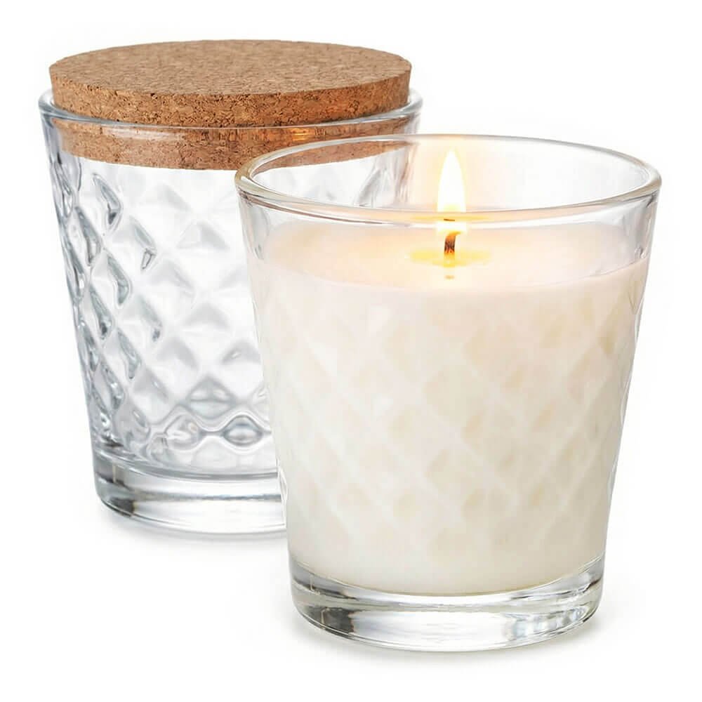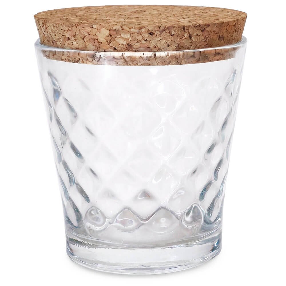 Copo de vidro Diamante com tampa de cortiça para velas aromáticas com uma capacidade de 260 ml, ideal para criar velas decorativas. Vendido vazio, fabricado em vidro transparente com formas de losangos e resistente ao calor, perfeito para suportar a cera quente. A tampa de cortiça de 85 x 77 x 15 mm é ideal para preservar o aroma das velas. O que você precisa para fazer velas aromáticas em copo? Cera, essência aromática, corante e pavio encerado. Além disso, você pode decorar o copo com as etiquetas disponíveis em nossa loja online. Lembre-se de não encher o copo até o topo e deixar espaço para o pavio. Dica! Aqueça ligeiramente o copo antes de despejar a cera para evitar manchas e bolhas no vidro.
