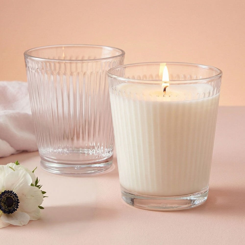 Copo de vidro estriado para velas aromáticas com uma capacidade de 280 ml, ideal para criar velas decorativas. Vendido vazio, fabricado em vidro transparente estriado e resistente ao calor, perfeito para suportar a cera quente. O que você precisa para fazer velas aromáticas em copo? Cera, essência aromática, corante e pavio encerado. Além disso, você pode decorar o copo com as etiquetas disponíveis em nossa loja online. Lembre-se de não encher o copo até o topo e deixar espaço para o pavio. Dica! Aqueça ligeiramente o copo antes de despejar a cera para evitar manchas e bolhas no vidro.