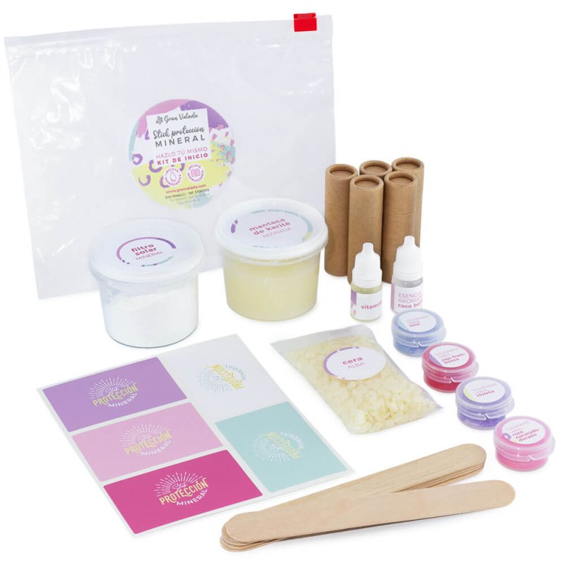 Materiais + videotutorial passo a passo para fazer sticks faciais com proteção solar mineral. Com este kit, poderás criar 5 sticks caseiros que cuidam e protegem a pele do rosto e dos lábios graças ao seu conteúdo em proteção solar mineral e ativos naturais. Inclui todos os ingredientes, embalagens reutilizáveis de cartão, autocolantes decorativos e um código QR que dá acesso a um vídeo explicativo com todas as etapas. Nem sequer precisas de experiência prévia em cosmética DIY! É uma opção prática, sustentável e criativa para cuidares de ti ou ofereceres um presente útil, ecológico e feito à mão.