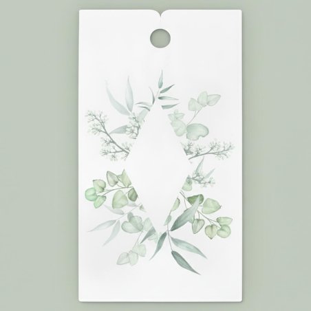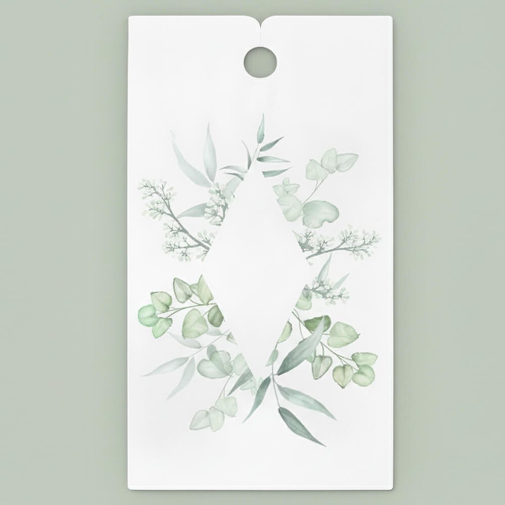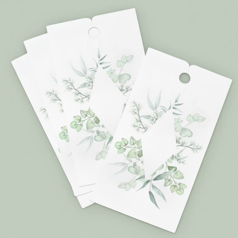 Estes cartões para packaging são uma opção ideal para dar um toque especial e cuidado às suas ofertas. O seu design botânico em tons de verde transmite um ar fresco e elegante, perfeito para apresentar cera perfumada, cerâmica perfumada ou wax sachets em casamentos, comunhões e outros eventos. Ao combiná-los com um saco de celofane ou uma fita decorativa, conseguirá uma apresentação única e memorável.