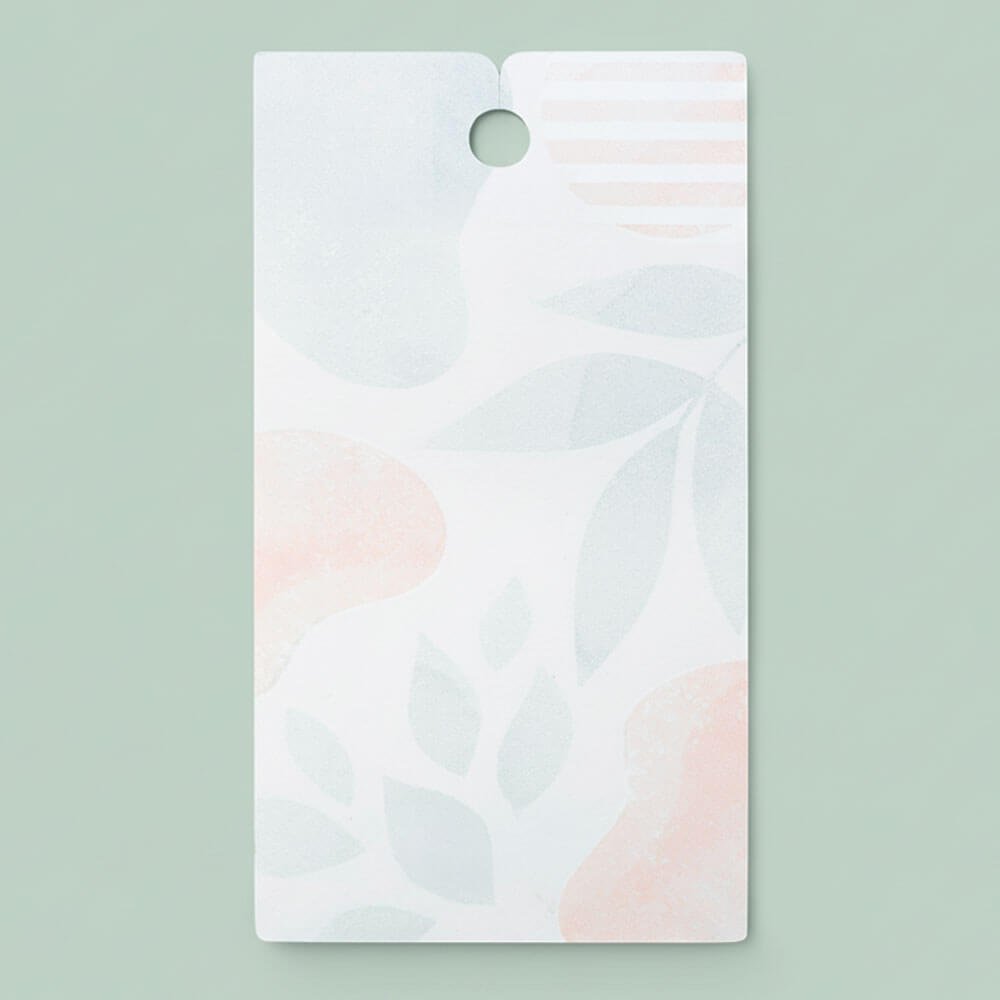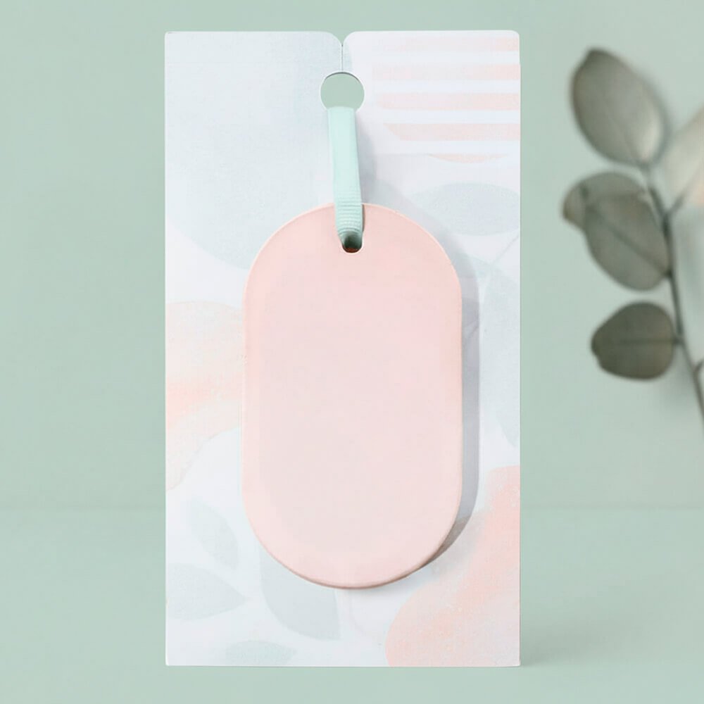 Versátil e prático, este cartão funciona como suporte para tabletes aromáticas, ambientadores sólidos, mini sabonetes, velinhas, cerâmica perfumada ou mini perfumes. Inclui um orifício superior para passar fita, cordão ou laço e prender confortavelmente as suas criações, ou até pendurá-las se necessário.
