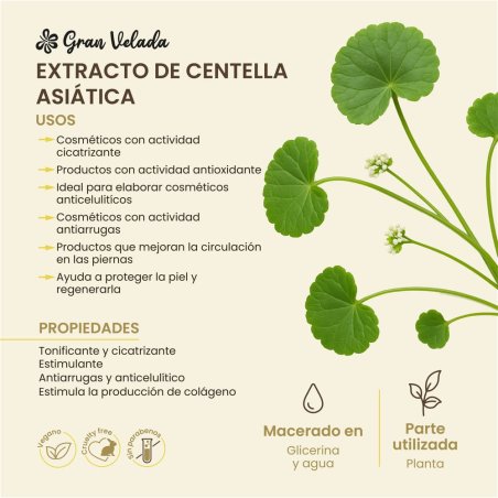 O extrato de centelha asiática que você pode comprar em Gran Velada é obtido ao macerar a parte aérea desta planta em glicerina e água, portanto é um extrato hidrossolúvel que pode fazer parte de receitas que possuem uma fase aquosa. Pode ser incorporado na preparação de cremes, tônicos, máscaras, bandagens corporais ...