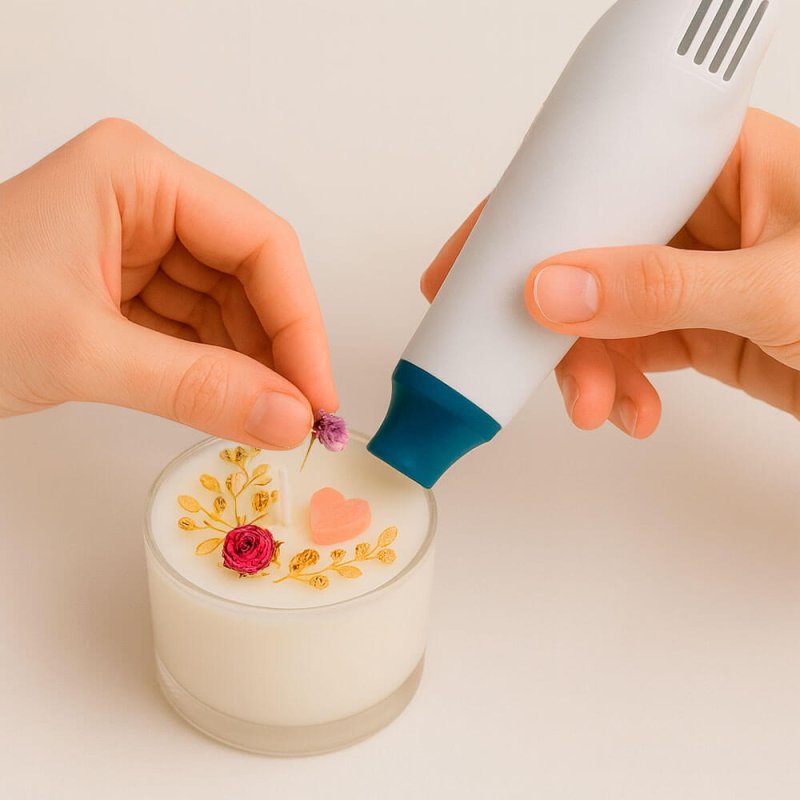 É a ferramenta perfeita para dar um acabamento profissional às tuas velas e outras manualidades. Permite aquecer de forma localizada e controlar pequenos detalhes sem tocar diretamente no projeto. Com ela poderás alisar a superfície da vela quando surgir efeito casca de laranja ou frosting, fundir ligeiramente para fixar flores secas ou decorações, eliminar bolhas em camadas finas de cera e reativar o brilho. Além disso, é muito útil para pré-aquecer copos e recipientes antes de verter a cera, reduzindo o risco de quebras por choque térmico.