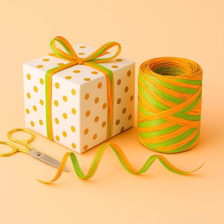 Fita de ráfia bicolor pistache-laranja, para decorar e personalizar seus presentes, brindes para convidados, artesanato, arranjos de florista e tudo que pode-se imaginar. A fita de ráfia bicolor pistache-laranja é ideal para fazer laços e decorar as embalagens das suas criações e os brindes dos convidados, com um ar rústico mas, muito colorido. Desde a Gran Velada oferecemos fita de ráfia bicolor pistache-laranja em rolos de diferentes tamanhos: 10 ou 200 metros. Somente terá que escolher o tamanho que melhor atenda às suas necessidades e processar a sua compra. Com a fita de ráfia bicolor pistache-laranja, conseguirá dar um toque de qualidade e profissionalismo a qualquer um dos seus embrulhos.