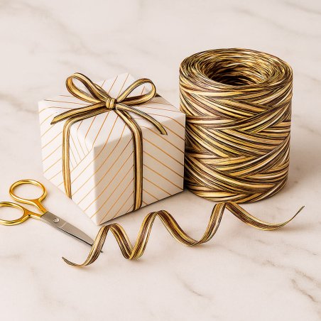 Fita de ráfia tricolor choco-dorado-natural, para decorar e personalizar seus presentes, brindes para convidados, artesanato, arranjos de florista e tudo que pode-se imaginar. A fita de ráfia tricolor choco-dorado-natural é ideal para fazer laços e decorar as embalagens das suas criações e os brindes dos convidados, com um ar rústico mas, muito colorido. Desde a Gran Velada oferecemos fita de ráfia tricolor choco-dorado-natural em rolos de diferentes tamanhos: 10 ou 200 metros. Somente terá que escolher o tamanho que melhor atenda às suas necessidades e processar a sua compra. Com a fita de ráfia tricolor choco-dorado-natural, conseguirá dar um toque de qualidade e profissionalismo a qualquer um dos seus embrulhos.