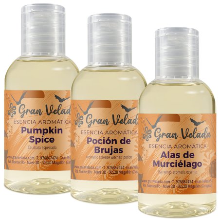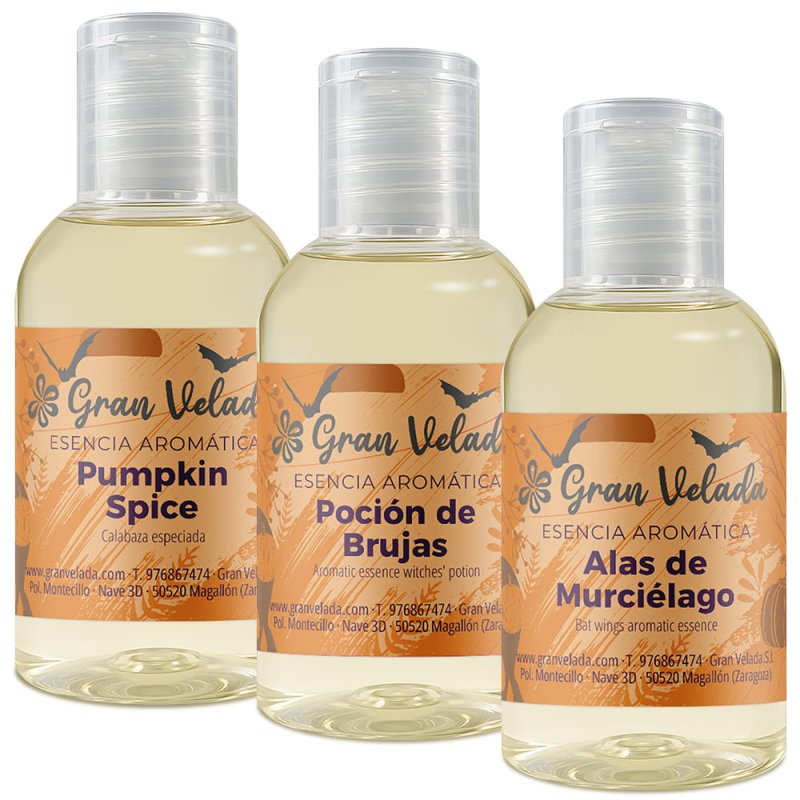 Pack poupança essências Halloween especiadas da Gran Velada. Este pack inclui três essências únicas e evocadoras: abóbora especiada, asas de morcego e poção de bruxas, todas no formato de 50 ml. Foram especialmente selecionadas para que possas dar vida às tuas criações DIY com fragrâncias que capturam a essência mais mágica do Halloween. Perfuma os teus sabonetes, velas, ambientadores ou cosmética caseira e cria uma atmosfera envolvente, quente e ligeiramente inquietante. Um trio irresistível para desfrutar do lado mais encantador do outono!