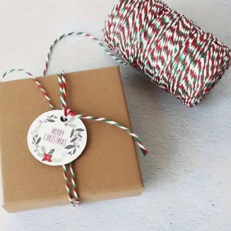 Rolo de 100 metros de cordão de algodão natalício para embalagens. Cordão entrançado em tons de vermelho, verde e branco, ideal para dar um toque festivo aos teus embrulhos e detalhes. Fabricado em algodão, com um toque suave e fácil de manusear. Na Gran Velada podes comprar cordão de algodão natalício para packaging, embrulhar presentes e decorar projetos DIY. Com ele podes finalizar embalagens, atar etiquetas ou fechar saquinhos. Também é perfeito para decorar velas em frascos, pendurar enfeites, sabonetes de pendurar ou placas de cerâmica perfumada.