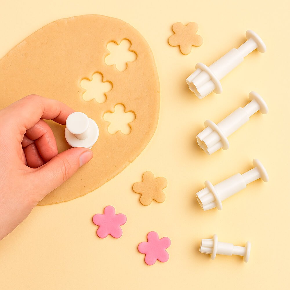 Conjunto de 4 cortadores em forma de flor com êmbolo, ideal para trabalhar com fondant, bolachas, sabonete de glicerina ou massas moldáveis de forma precisa e confortável. Inclui quatro tamanhos diferentes que permitem criar composições decorativas com efeito floral em relevo. Graças ao seu sistema de êmbolo, facilita tanto o corte como a extração da peça sem a deformar, sendo perfeito para pastelaria criativa e projetos DIY.