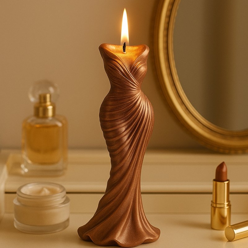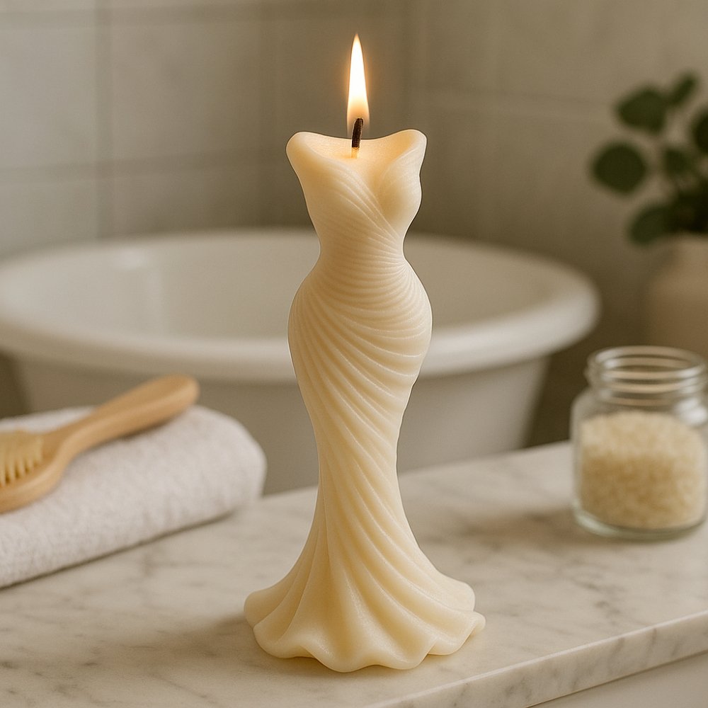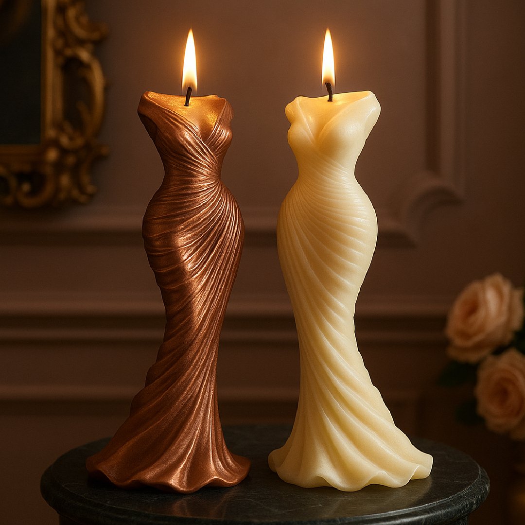 Molde vestido drapeado em silicone para fazer velas decorativas com um acabamento escultural e elegante. Ideal para design de interiores, montras, boutiques de moda e amantes do design. O molde é antiaderente, flexível e resistente, fácil de usar e desmoldar. Podes personalizar a vela com pigmentos metálicos ou deixá-la em tons neutros para um visual sofisticado.