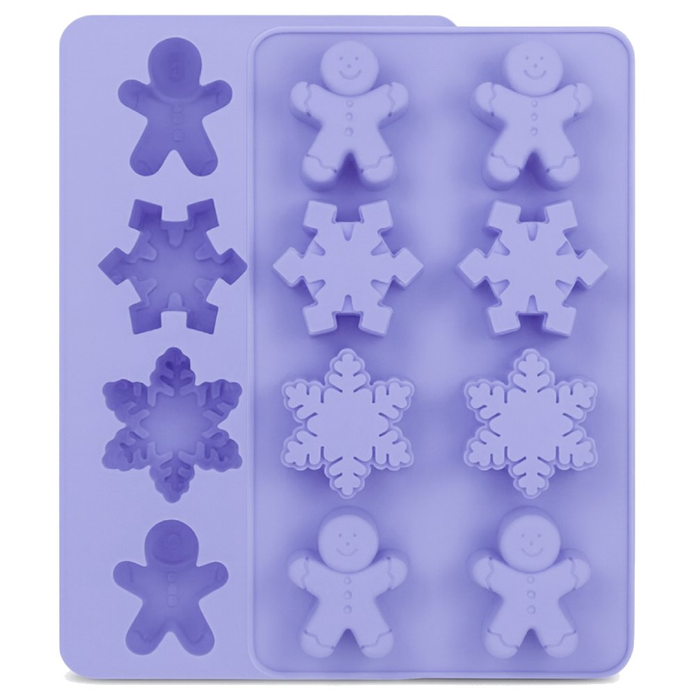 Molde de silicone com 8 cavidades para fazer artesanatos natalinos em forma de bonecos de gengibre e flocos de neve. Perfeito para criar sabonetes e decorações DIY festivas. Este molde é antiaderente, flexível e resistente, facilitando o desenforme e permitindo um acabamento detalhado.