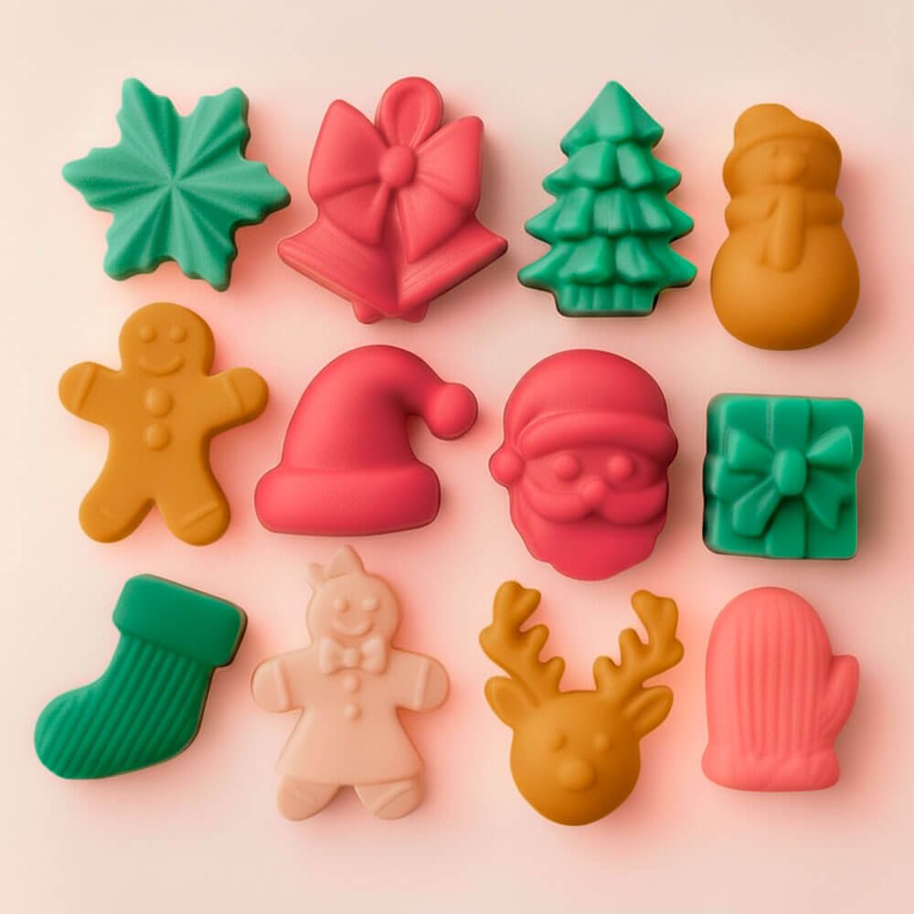Este molde de silicone com 12 cavidades permite-te produzir em série cera perfumada (wax melts), toppings para velas chantilly, mini sabonetes de glicerina e figuras rígidas com resina à base de água, gesso ou cimento leve para ímanes, embalagens ou calendários do Advento. A silicone é flexível, antiaderente e reutilizável, o que facilita o desenformar e garante que os detalhes natalícios (árvore, estrela, gorro, boneco, etc.) fiquem bem definidos.