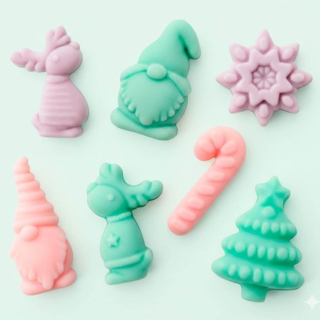 Molde figuras de Natal com gnomos e renas para fazer sabões, ceras perfumadas e trabalhos manuais de Natal. É um molde de silicone com 16 cavidades em formas típicas da época, como gnomos, renas, árvores e bengalas doces. Com ele poderás criar várias figuras de uma só vez e obter resultados com excelente detalhe. Trata-se de um molde versátil, perfeito para preparar decorações e presentes natalícios feitos em casa.