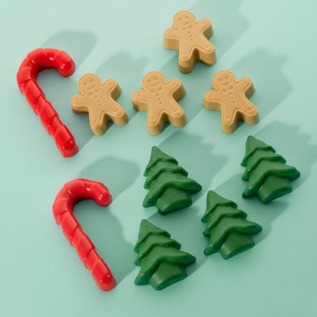 Molde de Natal para wax melts e toppings com figuras clássicas natalícias: bengala de açúcar, boneco de gengibre e pinheirinho. Perfeito para fazer wax melts (cera perfumada), mini sabonetes ou toppings para decorar velas em copo com cera chantilly. As peças ficam bem definidas e são muito decorativas para oferecer ou perfumar no Natal.