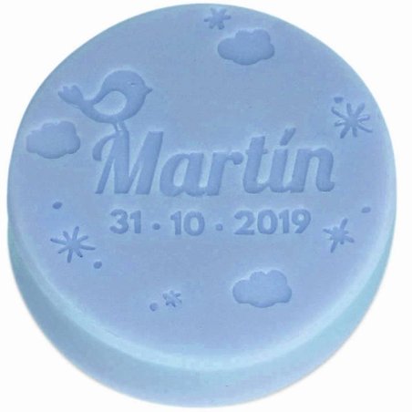 Molde de pomba para personalizar com nome e data. Molde de 6,5 cm de diâmetro para fazer um sabão de 80 gramas aprox. É ideal para fazer sabonetes como um detalhe de batizado ou comunhão. O molde é decorado com design infantil e nós o personalizaremos com o nome e a data que indicar. Para nomes compostos ou com muitos caracteres, consulte as opções do nosso serviço ao cliente. É feito de silicone e caracteriza-se por ser resistente, antiaderente e flexível, por isso é fácil de usar. Para produtos personalizados não aceitamos a forma de pagamento a cobrança.