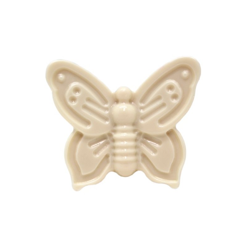 Molde para fazer sabonetes, borboleta figurada. Poderá fabricar as suas próprias pastilhas de sabonete caseiro de glicerina, similares aos da foto e com umas medidas de 7x6 cm e uma profundidade máxima nas asas de 2,6 cm. Cada pastilha de sabonete borboleta figurada tem um peso de 94 gramas, pelo que com 1 quilo de sabão base poderá fazer o fabrico aproximado de 10 pastilhas de sabonete borboleta. Molde apto para (sabão) base glicerina, gesso, resina, velas e artesanatos, em geral. Este molde não requer desmoldante.
