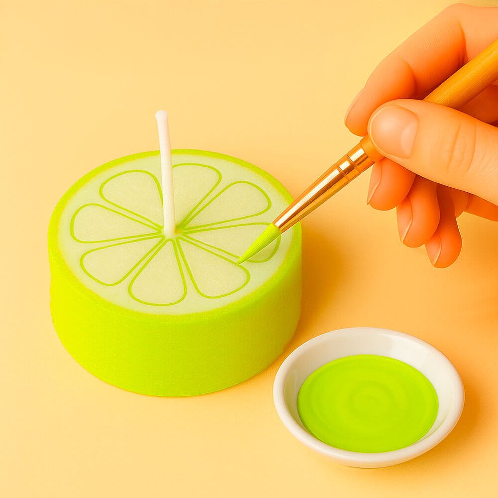 A seguir mostramos passo a passo como usar a tinta para velas. Seca rapidamente e adere facilmente a qualquer superfície de cera. Podes aplicá-la com pincel para detalhes precisos, com esponja tipo stencil para efeitos criativos ou com a técnica de imersão para cobrir toda a vela.