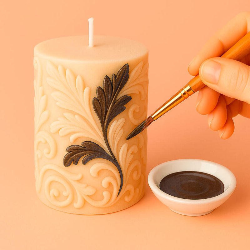 A seguir mostramos passo a passo como usar a tinta para velas. Seca rapidamente e adere facilmente a qualquer superfície de cera. Podes aplicá-la com pincel para detalhes precisos, com esponja tipo stencil para efeitos criativos ou com a técnica de imersão para cobrir toda a vela.