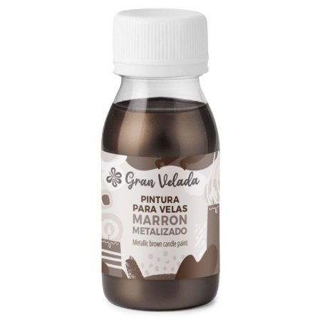 Tinta para velas castanho metalizado, ideal para pintar superfícies de cera. Com ela poderás decorar as velas e candeeiros que fizeres em casa. A tinta para velas que podes comprar na Gran Velada tem formato líquido e é muito fácil de usar. Só tens de agitá-la e aplicá-la com um pincel ou esponja sobre a superfície que queres pintar. Seca rapidamente. Também podes usar um molde para obter criações totalmente personalizadas. O seu acabamento metalizado dá um toque elegante e luminoso às tuas velas. Compra facilmente na nossa loja online!