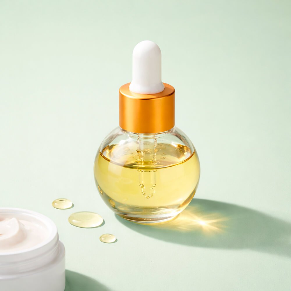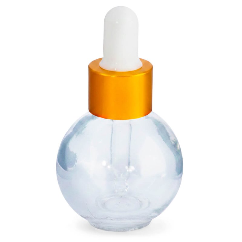 Frasco com conta-gotas de 20 ml fabricado em vidro transparente. É composto pelo frasco de vidro e por um tampão conta-gotas com fecho de rosca em acabamento dourado e tetina de borracha branca, que permite uma dosagem precisa e confortável. É vendido vazio para que possas envasar o líquido que desejares. Estes frascos conta-gotas são ideais para conservar séruns, óleos, extratos, perfumes artesanais ou preparações cosméticas líquidas. Um recipiente prático, funcional e elegante, perfeito tanto para uso pessoal como profissional.