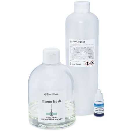 Reposição ozono fresh para fazer ambientadores e mikados. Inclui álcool + essência + corante. Basta misturá-los e você está pronto para começar! O pack vem com as quantidades certas, basta misturá-las. Você obterá uma fragrância que cheira maravilhoso. Esta recarga é ideal para aromatizar qualquer ambiente. Também é perfeito para o carro, o escritório... O pack de recarga de mikado que pode comprar na Gran Velada foi concebido para misturar e recarregar os seus ambientadores. É rápido e fácil de usar! Além disso, foi projetado para ter intensidade e durabilidade. Para fazer seus mikados em casa você só precisa de um desses refis, uma jarra de vidro e varetas de rattan. Estas recargas também serão utilizadas para preparar ambientadores em spray ou para fabricar ambientadores para automóveis. Eles são muito versáteis e se espalham muito. Na Gran Velada você encontrará um amplo catálogo de recargas de ambientadores. Obtenha o seu favorito!