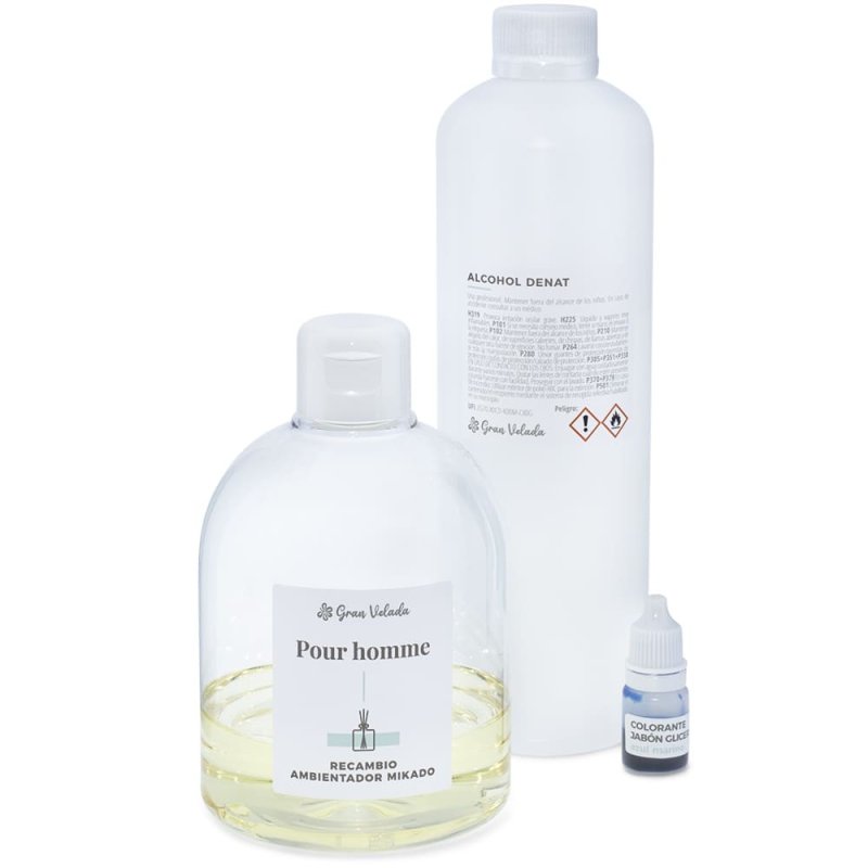 Recambio pour homme para hacer ambientadores y mikados. Incluye alcohol + esencia + colorante. ¡Solo tienes que mezclarlos y listo para utilizar! En el pack vienen las cantidades adecuadas para que solo tengas que mezclarlos. Conseguirás una fragancia con aromas cálidos y especiados y toques de madera. ¡Muy masculina! Este recambio es ideal para aromatizar cualquier estancia. También es perfecto para el coche, la oficina… El pack de recambio para mikado que puedes comprar en Gran Velada está ideado para mezclar y rellenar tus ambientadores. ¡Es rápido y sencillo de usar! Además, está diseñado para que tenga intensidad y durabilidad. Para hacer tus mikados en casa solo necesitas uno de estos recambios, un frasco de cristal y varillas de rattan. Estos recambios también te servirán para preparar ambientadores en spray o para hacer ambientadores de coche. Son muy versátiles y cunden mucho. En Gran Velada encontrarás un amplio catálogo de recambios de ambientador. ¡Hazte con tu preferido!