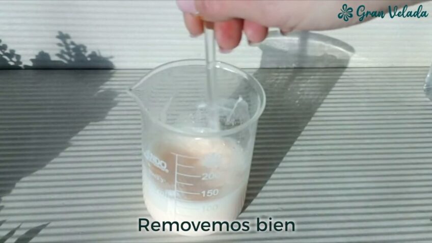 Mezclar hasta integrar todos los ingredientes. Vaporizar con alcohol 96º el molde y el jabón fundido para lograr que las letras queden bien definidas y disipar posibles burbujas.