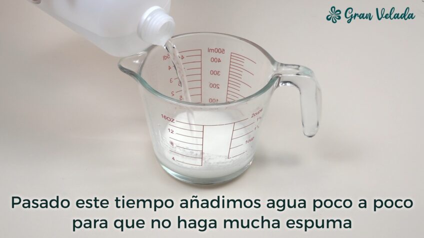 Dejar reposar la mezcla durante dos horas hasta que se integren bien todos los componentes. Transcurrido este tiempo añadir el agua poco a poco para que no haga mucha espuma.
