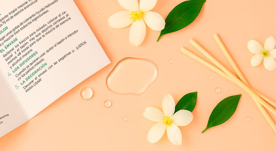 ¡Comenzamos con los mikados! Para hacerlos solo necesitas esencia aromática, alcohol 96º, palitos de rattan y un envase. ¿La fórmula? Mezcla un 70% de alcohol 96º con un 30% de esencia aromática, rellena el envase y coloca los palitos. ¡Fácil y rápido!